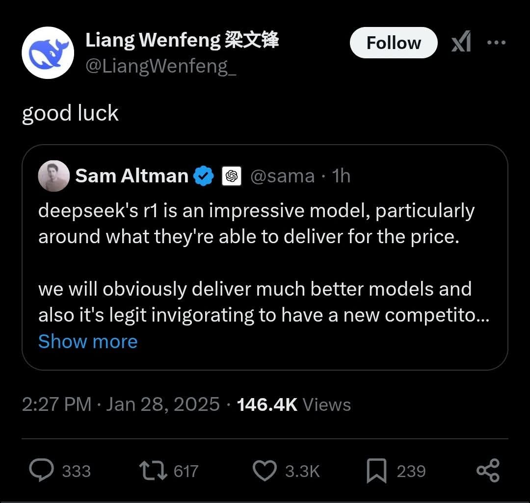 Bunun yanısıra, trajikomik olarak ilk çıkan yapay zeka modeli OpenAi ChatGPT insanlığı nasıl yok edecek konulu tartışmalar yapıldığından beri ilk defa bir yapay zekanın başka bir yapay zeka tarafından yok edilme ihtimali konuşulmaya başlandı. Yani, yapay zeka kimlerin işini elinden alacak tartışılır ama, bir yapay zeka DeepSeek diğer yapay zeka ChatGPTnin işini elinden alabilir!