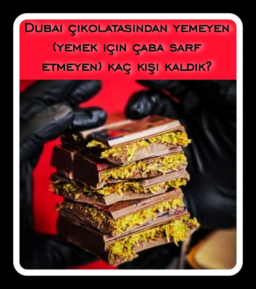 Kadının biri dünyanın bir yerinde çikolataya aşermişmiş, aradığını bulamamışmış, o da kendine böyle bir çikolata yapmışmış falan filan... Fıstığının Antep fıstığı olduğunu söyleyen, baklavadan esinlendiğini söyleyen kadının, çikolatanın içinde baklavayla, hatta kadayıf, künefe vs gibi hiçbirşeyle alakası olan birşeyin olmamasına rağmen, dünyanın her yerinde üretimi için yarışa girilmiş sosyal medyanın ve onun başdöndürücü kapitalizm şöleninin yeni kakası olan bu Dubai Çikolatası dedikleri şeyi inceliyoruz...